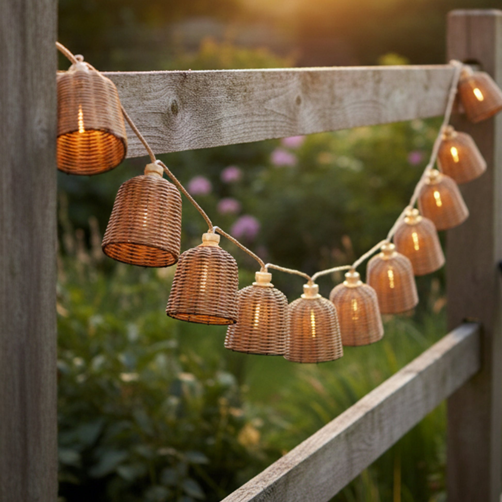 Guirlande lumineuse extérieur raccordable 10 abat-jour en poly rotin FORMENTERA BIG HYBRID blanc chaud 8m solaire et sur secteur