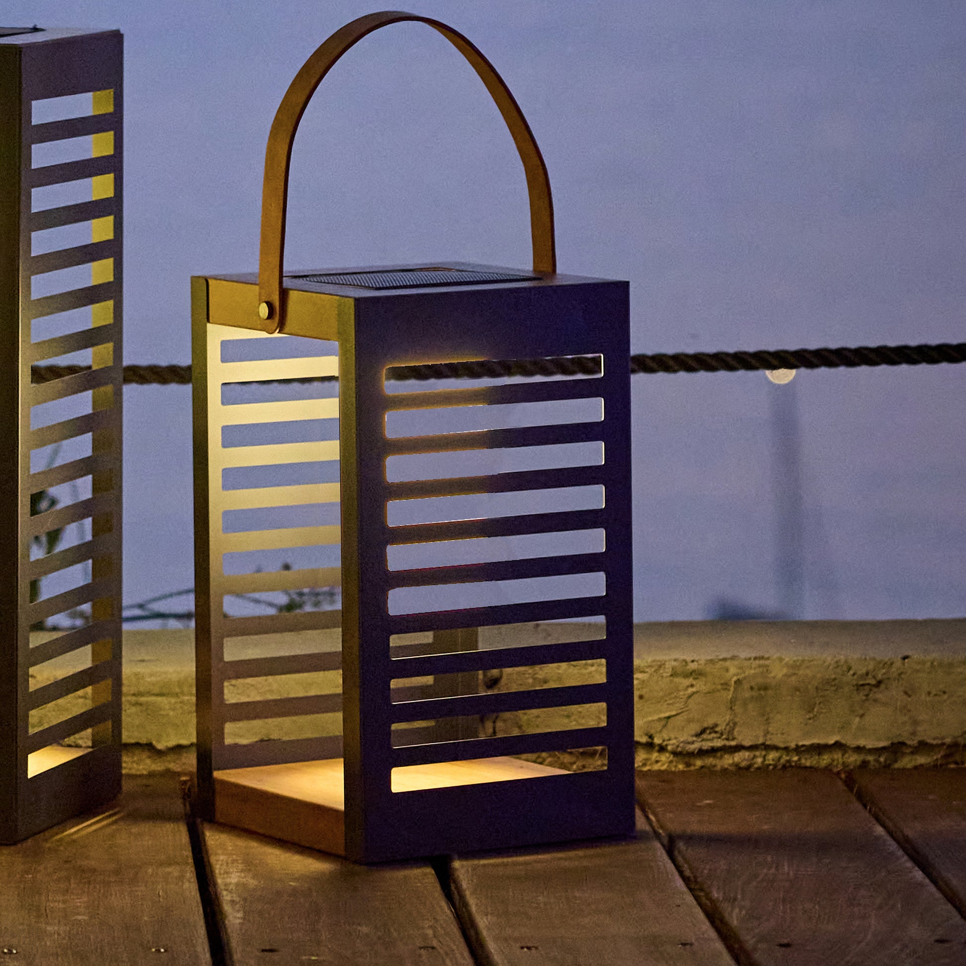 La lanterne solaire LED Ferian Small en métal avec finition effet bois est équipée de la base rechargeable Sunny Square amovible. Elle propose trois modes d'éclairage blanc chaud (90, 180 et 300 lumens) pour une autonomie atteignant 16 heures en mode faible. La recharge complète nécessite 8 heures d'ensoleillement ou 5 heures par câble magnétique. Ce modèle dispose d'un capteur Daylight pour une activation intelligente et d'une télécommande pour le contrôle à distance. D'une hauteur de 35 cm pour 20 cm de largeur, elle est certifiée IP65 contre les intempéries et les rayons UV. Sa structure robuste garantit une excellente durée de vie technique au bord d'une piscine ou sur une terrasse. L'entretien reste simple : un chiffon doux suffit pour conserver un rendu soigné au fil des saisons. Son câble souple facilite le positionnement autour d’une rambarde, d’un parasol ou le long d’un mur, et l’éclairage reste a