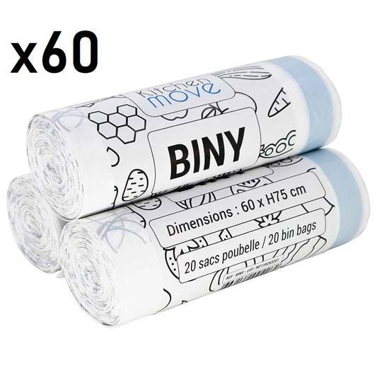 Lot de 60 sacs poubelles blanc 50L 60 x H75 CM BINY Ultra résistant 23 microns avec lien coulissant